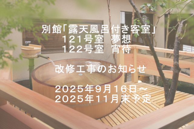 この度、別館光陰客室である、121号室「夢想」と122号室「宵待」において改修工事を行います。ご宿泊される皆様には大変ご不便をおかけいたしますが、何卒ご容赦いただければ幸いです。